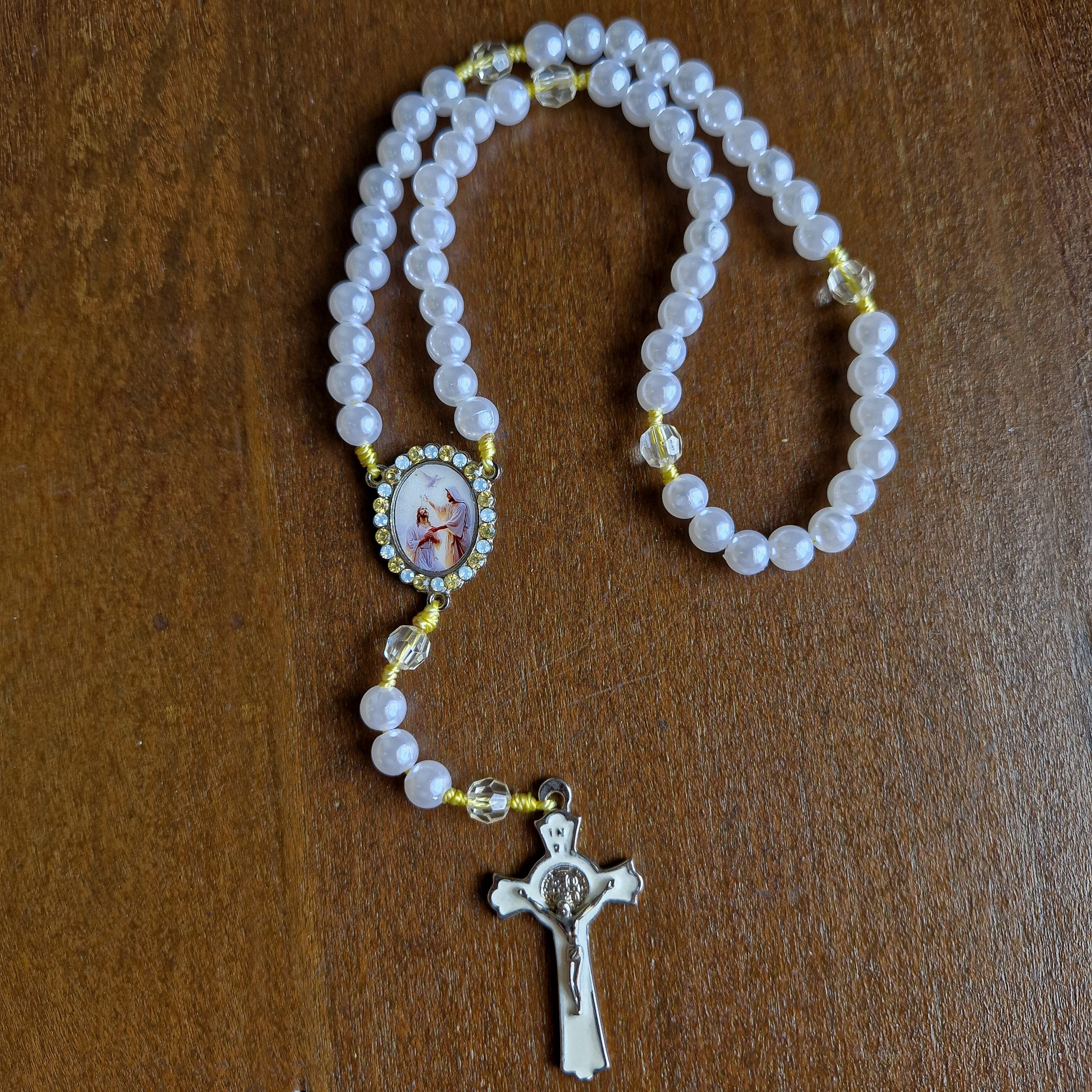 Terço dourado de São José com contas de cristal acrílico e um crucifixo, uma expressão profunda de devoção e proteção.