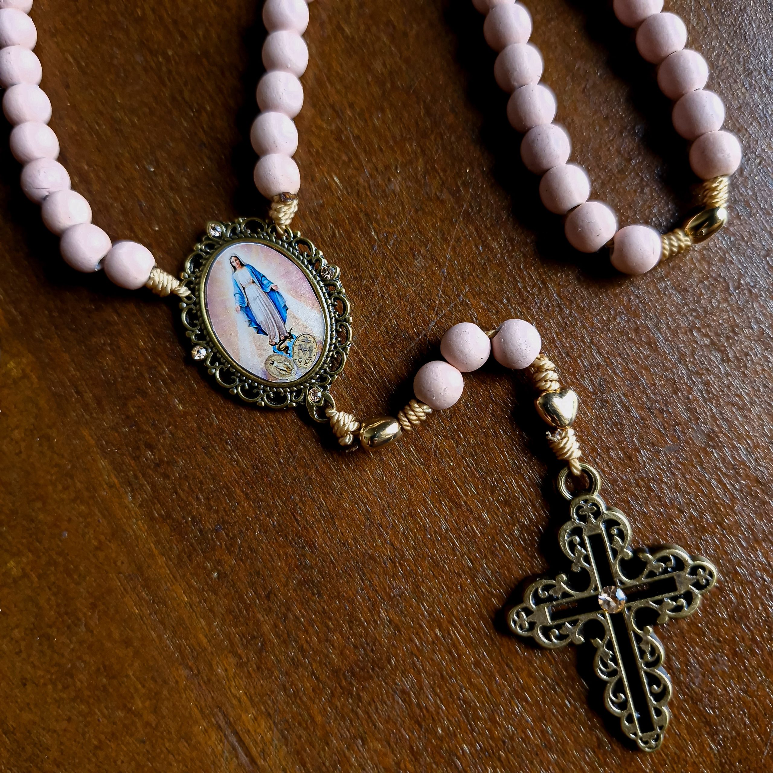 Terço infantil em rosa dedicado a Santa Terezinha, com contas acrílicas unidas pelo nó de São Francisco e detalhes artesanais em biscuit. Uma expressão de fé para os mais jovens.