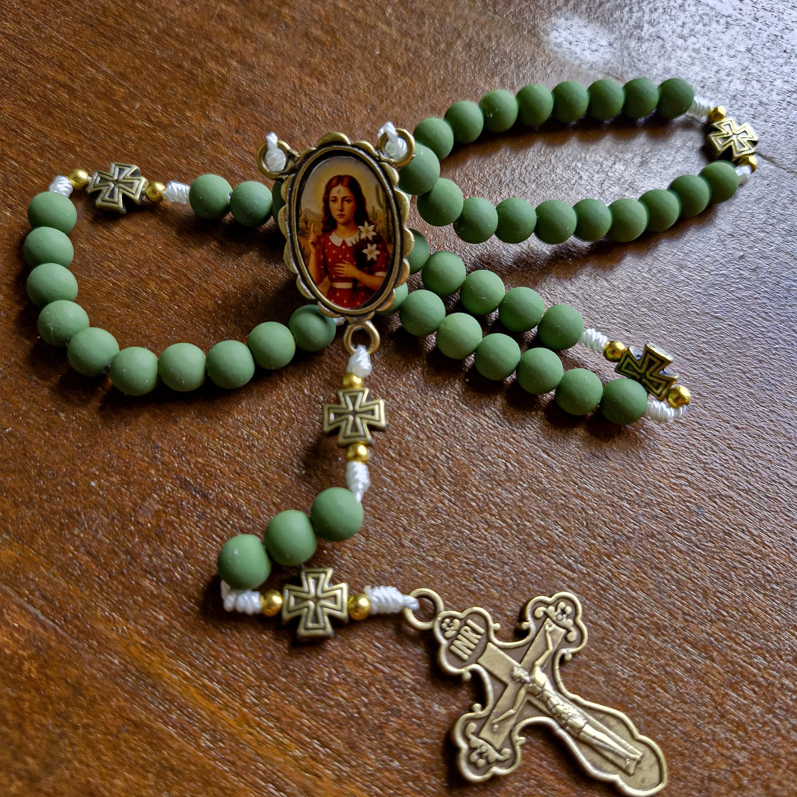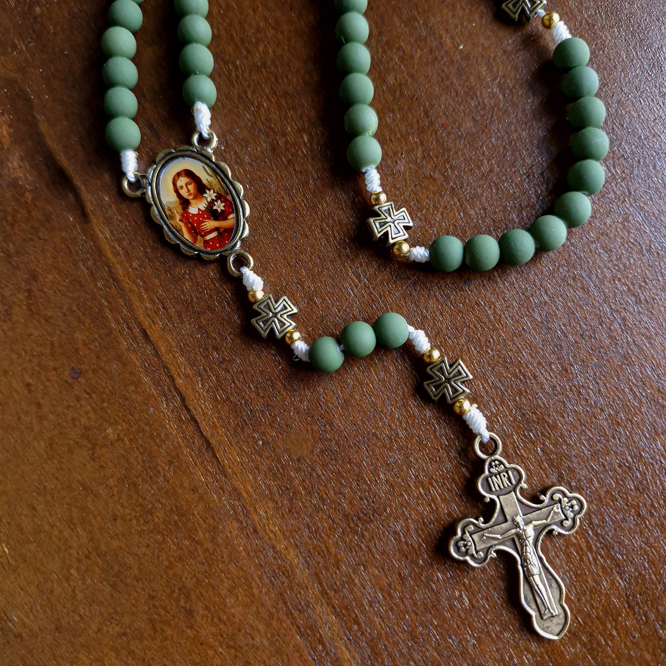 ✨ Terço da Beata Benigna Cardoso – Ouro Velho com Contas Verde Oliva ✨
