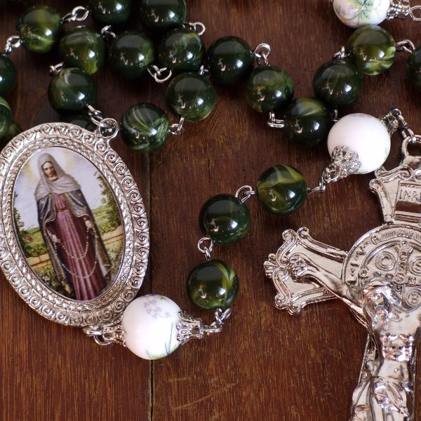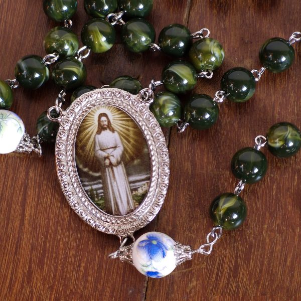 Confeccionado com contas verdes mescladas de 10mm, que simbolizam esperança e cura, e Pai-Nossos em porcelana chinesa de 12mm, que adicionam delicadeza e reverência à peça. A cruz em alto-relevo com a imagem de Jesus completa o conjunto com intensidade espiritual.