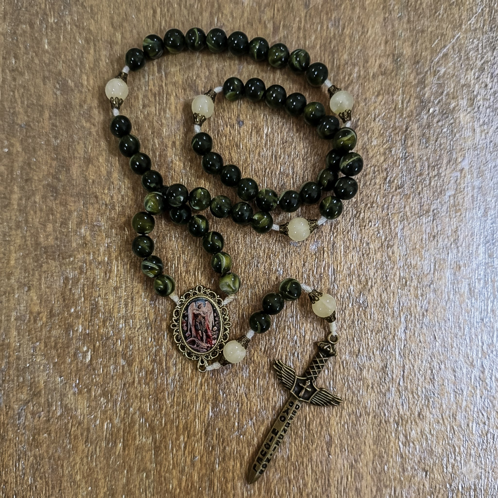 ✔ Pai-Nossos em Contas de Resina Marmorizadas Verde Musgo 10mm – Transmitem a força, a coragem e a firmeza da missão de São Miguel na luta contra o mal.