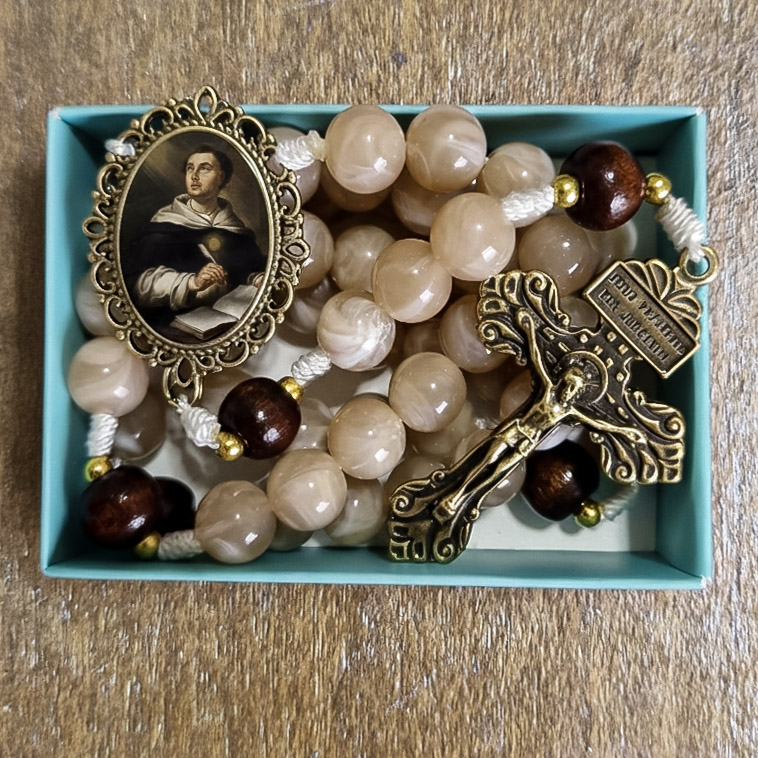 Um terço que expressa sabedoria, fé e profundidade espiritual, inspirado na vida e nos ensinamentos de São Tomás de Aquino, Doutor da Igreja.