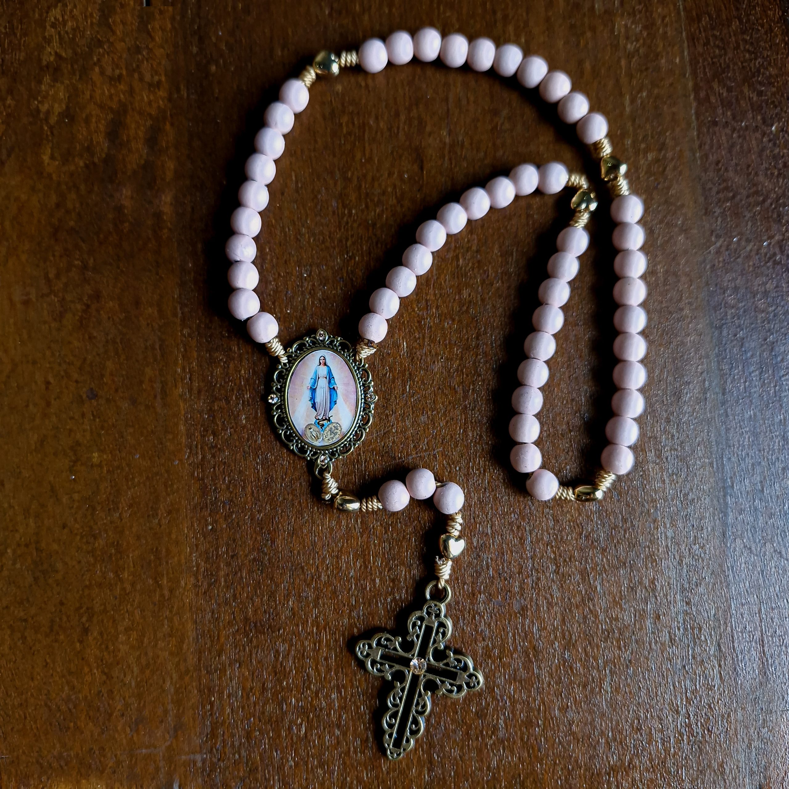 Um terço delicado e profundamente simbólico, que expressa fé, amor e confiança na intercessão de Nossa Senhora das Graças.
